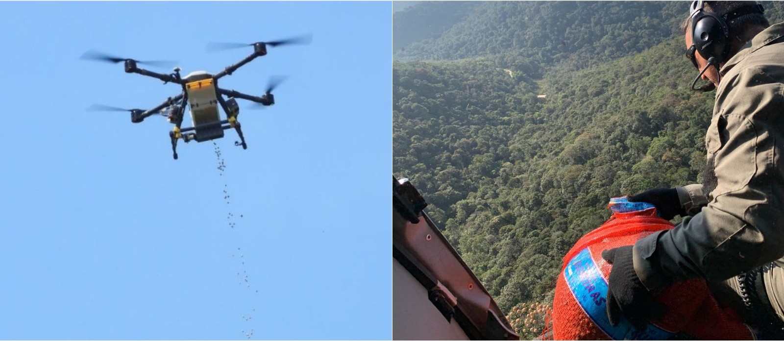 À esquerda, semeadura aérea através de drone, à direita, semeadura aérea por helicóptero. Fonte: Acervo FF