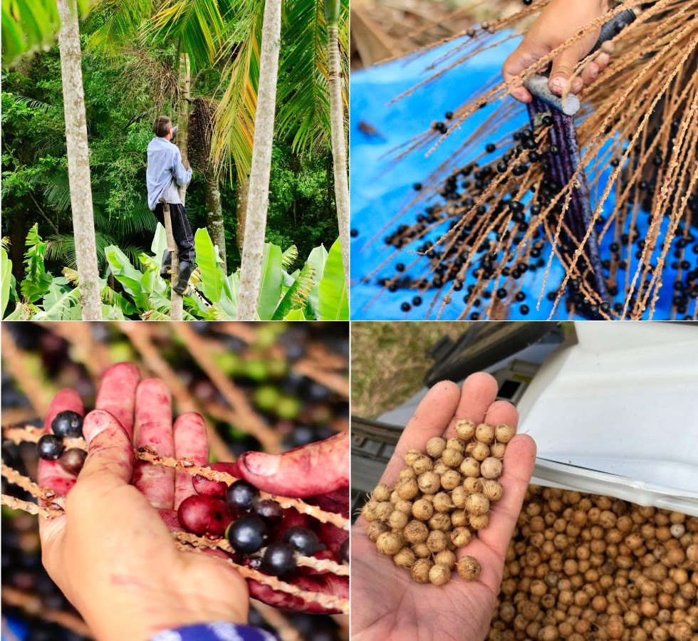 Coleta de cachos, separação do fruto, para posterior retirada da polpa, e sementes da palmeira-juçara. Fonte: Acervo